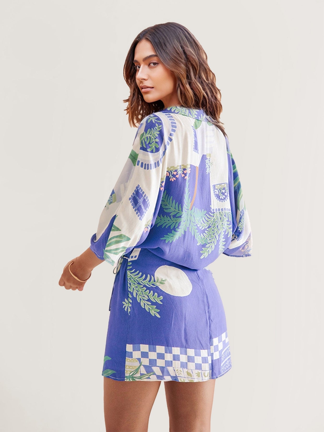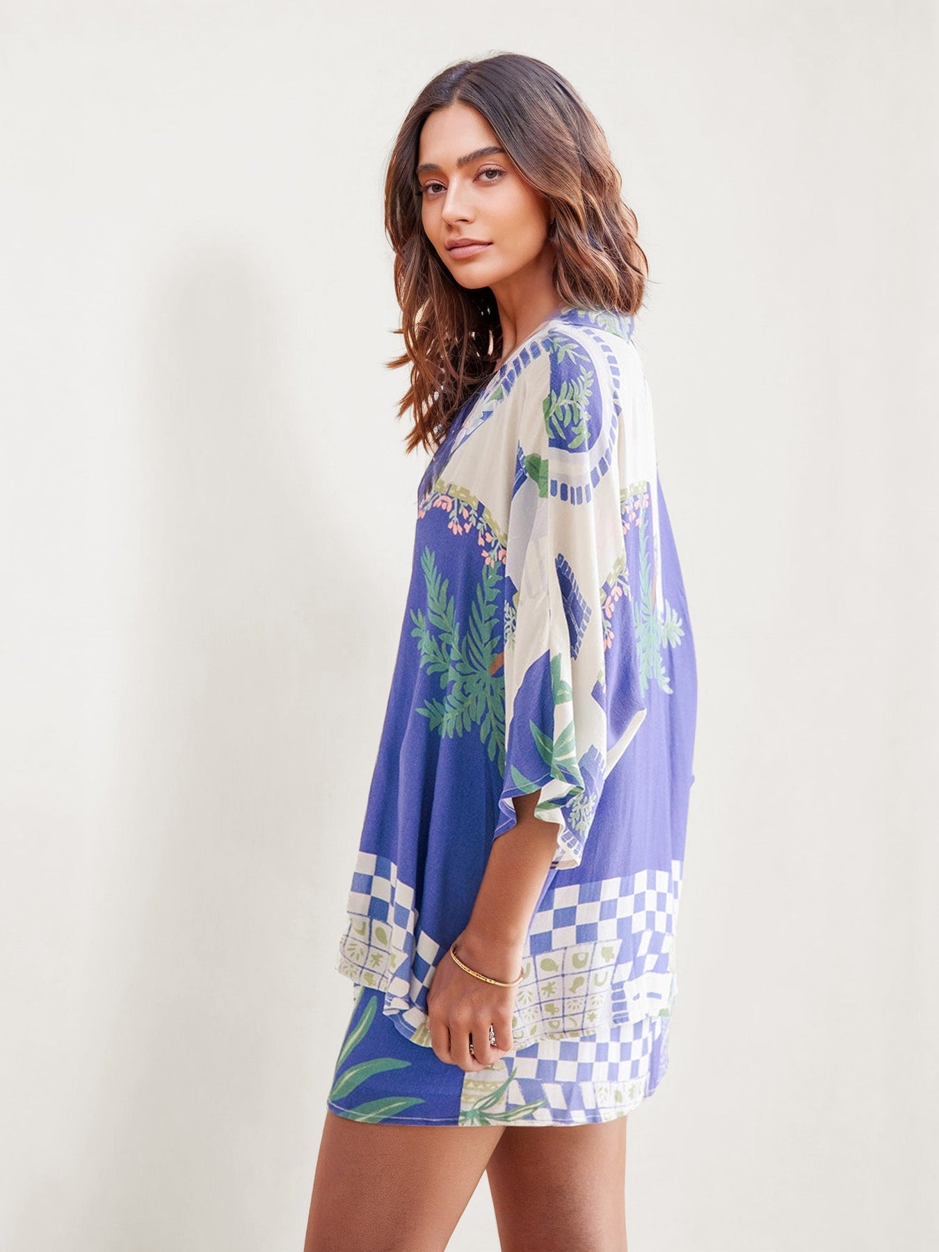Conjunto de dos piezas compuesto por camisa amplia y short a juego con un encantador estampado de inspiración mediterránea en tonos azul, blanco y verde. El diseño combina ilustraciones de follaje, cerámica y detalles geométricos que evocan paisajes costeros y veranos luminosos.