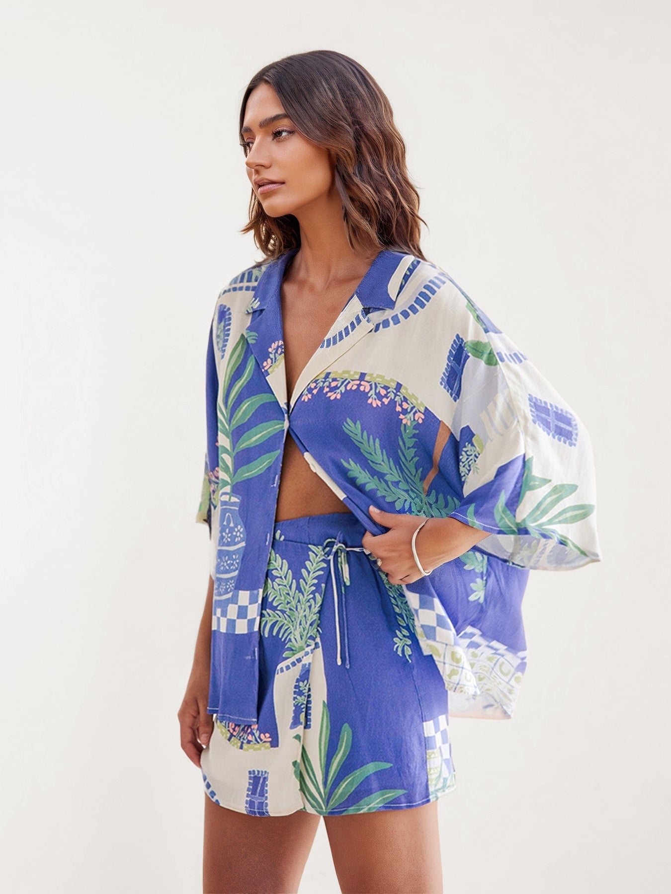 La camisa presenta cuello clásico, cierre frontal con botones y manga amplia tipo kimono, aportando una silueta relajada y fresca. El short es de tiro medio con cintura elástica y cordón ajustable, diseñado para brindar comodidad y un ajuste favorecedor.