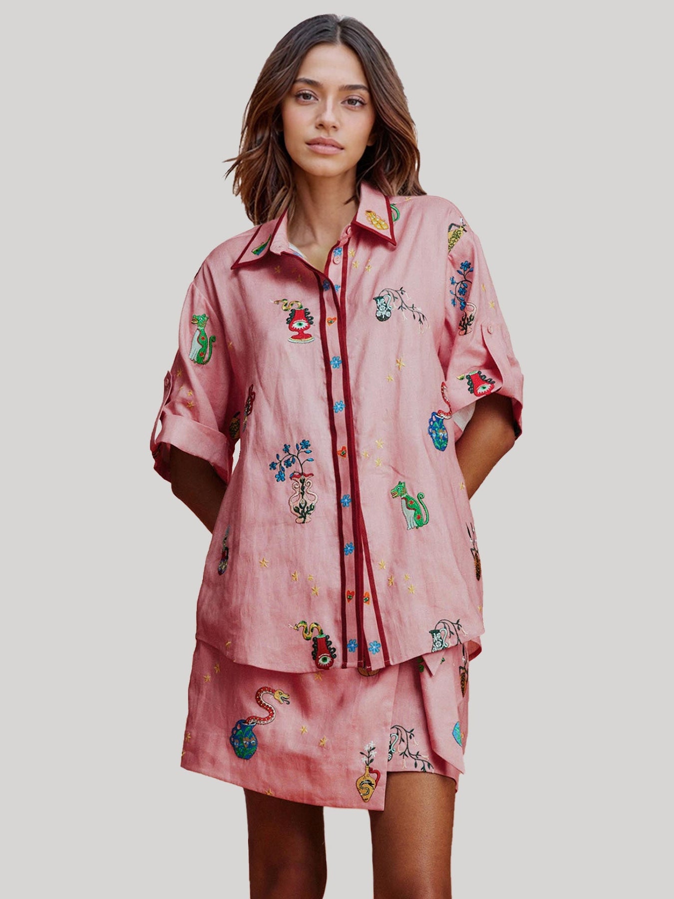 onjunto de dos piezas confeccionado en tejido ligero compuesto por camisa de corte relajado con cierre frontal y cuello clásico, combinada con short de tiro medio que incorpora cinturón ajustable para estilizar la silueta. Su diseño fluido y equilibrado aporta un aire moderno y versátil, ideal para crear looks actuales con total comodidad.